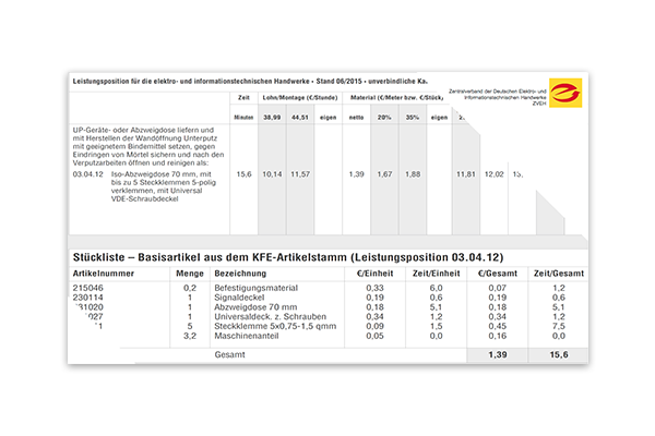 Für die Angebotskalkulation und die nachfolgende Fakturierung, für anstehende Prüfungen auf inhaltliche sowie preisliche Angemessenheit. Über 9.500 Artikel, mit denen sich ca. 14.000 Leistungspositionen für elektrotechnische Arbeiten abbilden lassen. Über 90.000 Artikel haben eine Bauzeit und einen durchschnittlichen Einkaufspreis.